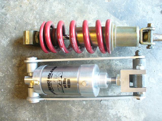 First step is to remove your existing shock assembly. The photo on the left shows the removed assembly. On the particular set-up I've been running for a cheap lowered look: stock dogbones, relay arm "flipped" (see "Flip" How-To), Eibach 1000 lb spring).