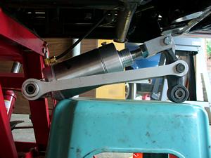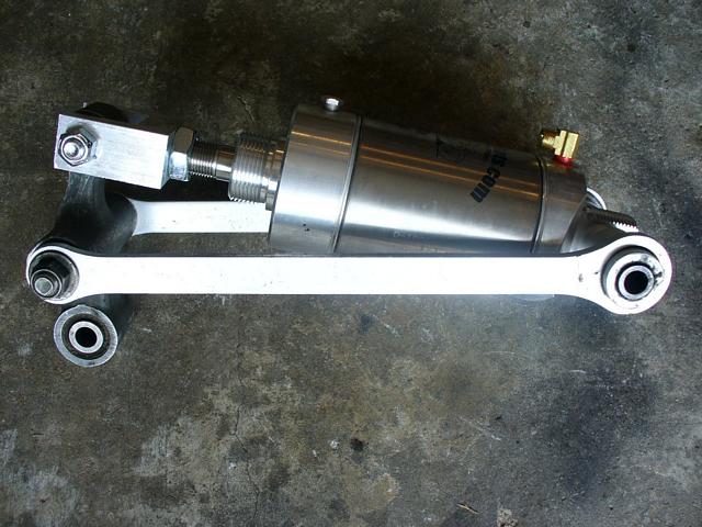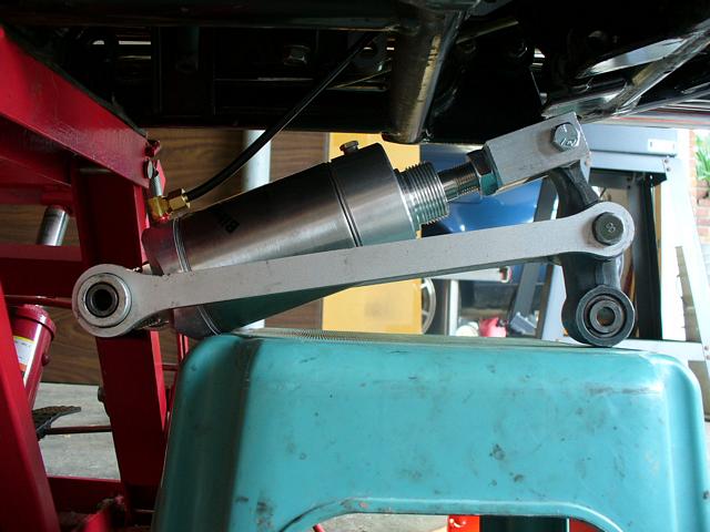 Top view of the assembled Big Boar cylinder. Note that I didn't screw the clevis down far at all onto the large threaded shaft of the air cylinder. Again...I have no idea what will work best for this set-up versus what I had before. Should I mount the clevis closer or farther from the cylinder? Should the relay arm be flipped or un-flipped?. These were two variables I just had to experiment with until I got what satisfied me (a decent raised height, but still a nice slammed look for the parking lot).