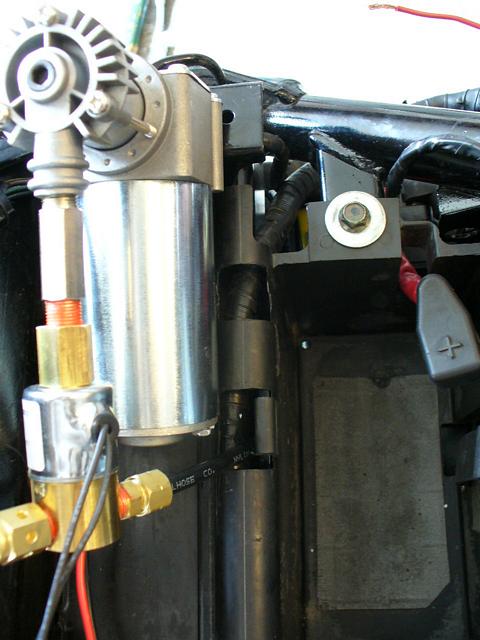 First you feed the air line down from behind the battery from under the seat (this will be more clear in the photos below). Then you attach the other end to the air cylinder. In order not to pull it out from where it comes up under the seat behind the battery, I propped the assembly up on a stool to attach the line to the cylinder.