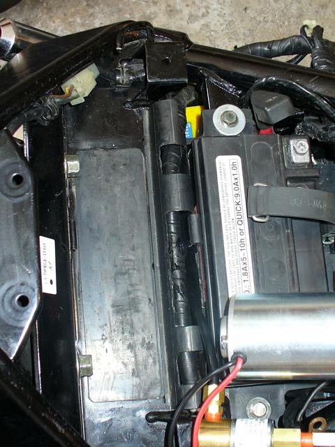 You can see here where the air line comes up behind the battery (the battery is removed in this photo). One problem though.... In order to get the air compressor completely under the seat horns (so the seat can mount properly), I need to shift the compressor and airline towards the right-hand side of the bike (down, in this particular photo). The plastic portion of the battery tray where the line comes up prevents me from doing this, so I'll have to modify it by opening up the space. |