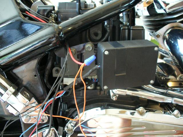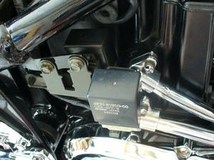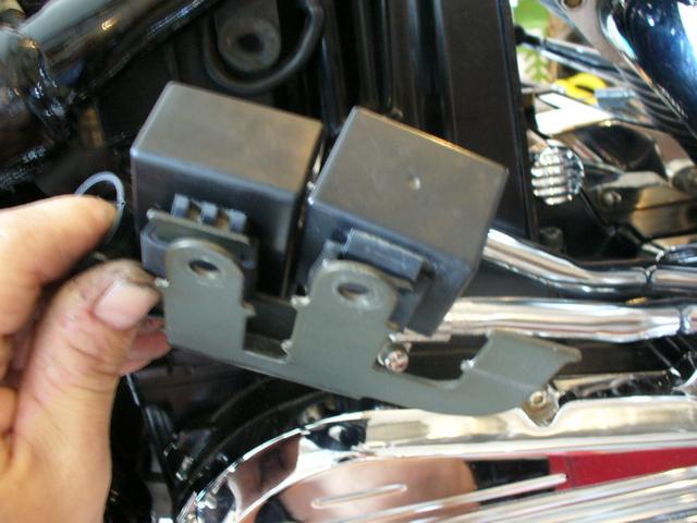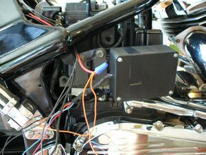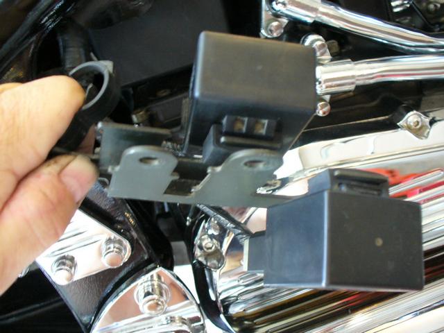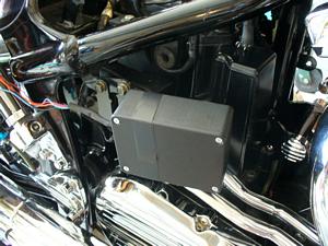Here is what the stock set-up looks like under the right-hand side cover. Theres a bracket with two small black boxes attached. One of these is the starter relay. Not sure what the other one is. |