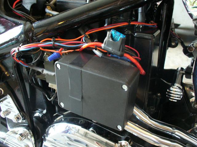 Last step before testing the unit is to connect the main power leads to the battery. You can see this in this photo, the large gray wire coming up from the right side cover and splitting the red to the positive battery terminal and the black to the negative battery terminal. (front of the bike is up in this photo)
