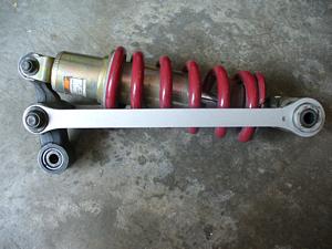 I don't have photos of the shock assembly in the more radical set-up (sorry). I didn't remove it completely from the bike. It was getting late in the day and I was a bit tired. So, I removed the rear bolt at the bottom of the relay, raised the rear control arm with a jack under the rear tire, dropped the rear of the assembly down, and made my changes. The front of the shock assembly was still attached to the frame up front.